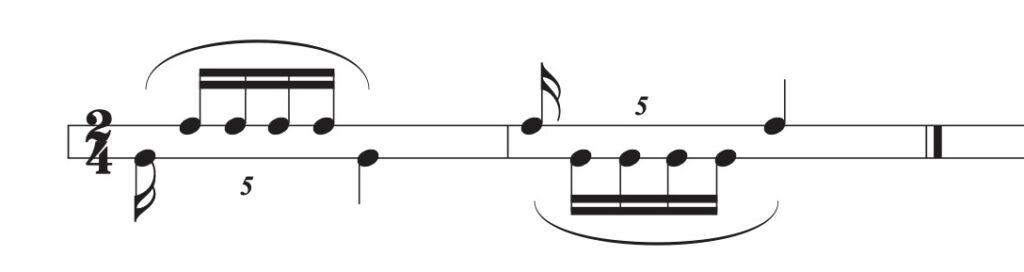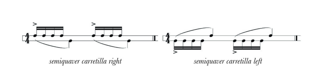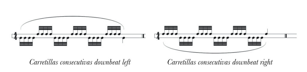 And now to the ‘quintuplets’: A quintuplet begins on the upbeat of the middle finger of one hand, followed by the four beats of the fingers of the other hand. All beats must be equally spaced, for example five semiquaver notes in the same period as four semiquaver notes evenly distributed. The downbeat follows on the first hand. Here, the upbeat is connected to the downbeat by a slur. The ‘carretilla seguida’, a series of successive quintuplets, is connected by a single slur. Here, too, if the downbeat is played with the left hand, the slur is above it; if it is played with the right hand, the slur is below it. The same applies to half carretillas, which are played as triplets with the fingers 3 and 4