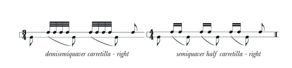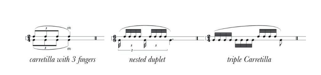 I begin a carretilla with a pulse beat starting from the little finger and then sliding each of the four fingers of one hand over the castanet in succession, applying pressure to produce a beat with each subsequent finger. To make it clear that this is a so-called ‘carretilla resbalada’, I use slurs, or ‘legato arcs’, in the notation.