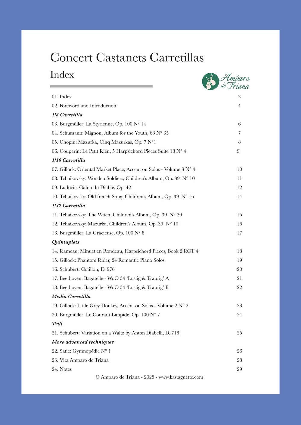 20 Etüden für das ausführliche Studium der Carretillas zu Musik von Chopin, Couperin, Beethoven, Burgmüller, Gillock, Ludovic, Rameau, Satie, Schubert, Schumann and Tschaikowsky –